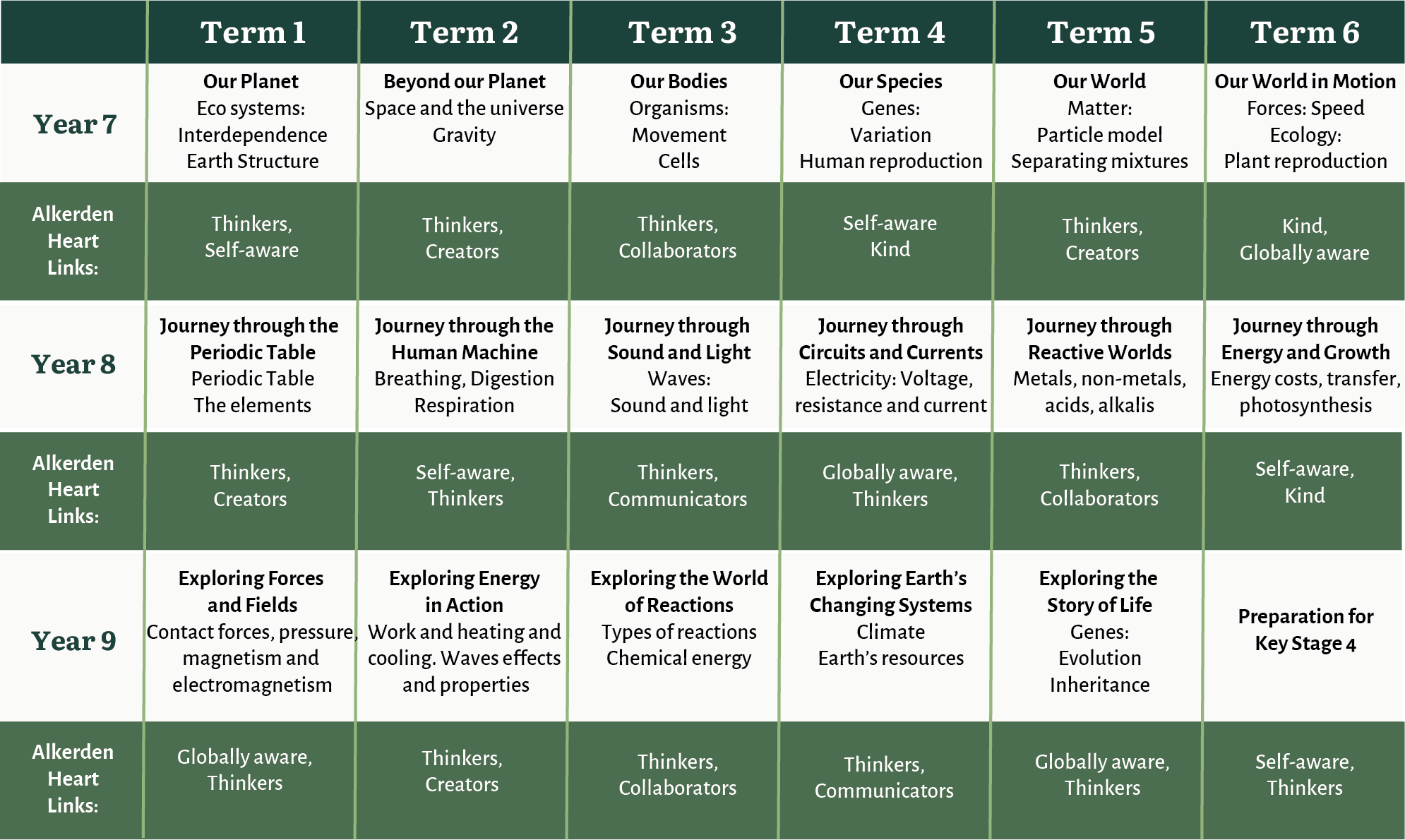 Anchored in the Alkerden Heart, our curriculum fosters the characteristics needed for learners to flourish. As Thinkers, learners are encouraged to interrogate ideas, challenge assumptions, and remain curious about the world. As Collaborators, they build resilience through practical investigations, working together to solve problems and analyse evidence. As Communicators, they are taught to use scientific language with precision and confidence, articulating their understanding clearly. We promote kindness, integrity, and global awareness, equipping learners not only with knowledge but with a sense of responsibility to apply science ethically for the betterment of society and the planet.