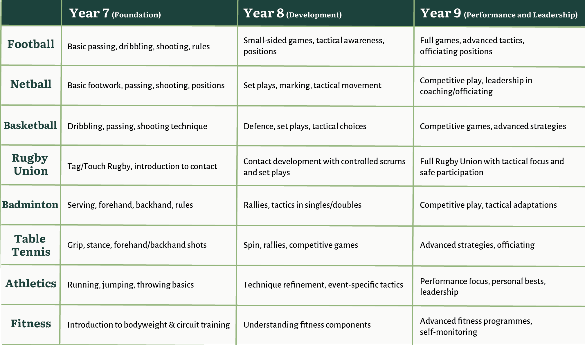 Sports and activities taught include: Football, Netball, Basketball, Rugby Union, Badminton, Table Tennis, Athletics, and (from the new school site) Fitness. During Year 1, the offer will be adapted due to temporary accommodation, but all core activities will be introduced across KS3 to ensure progression and breadth.