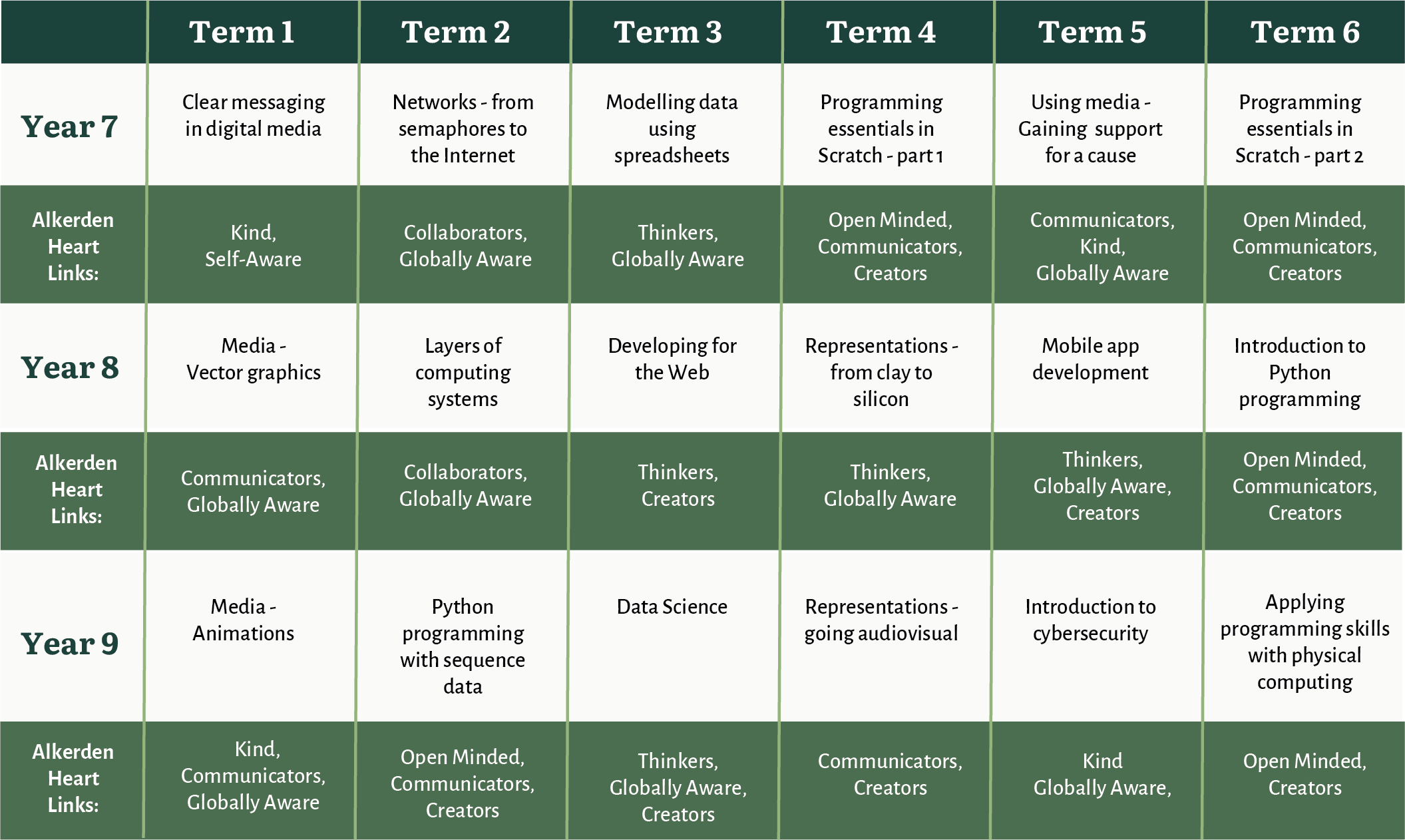 Our KS3 Computing learning journey is carefully sequenced to ensure progression in knowledge, skills, and creative independence. As with all areas of the curriculum at Alkerden Academy, it remains responsive to the needs of our learners and may be adapted over time to ensure every learner can thrive.