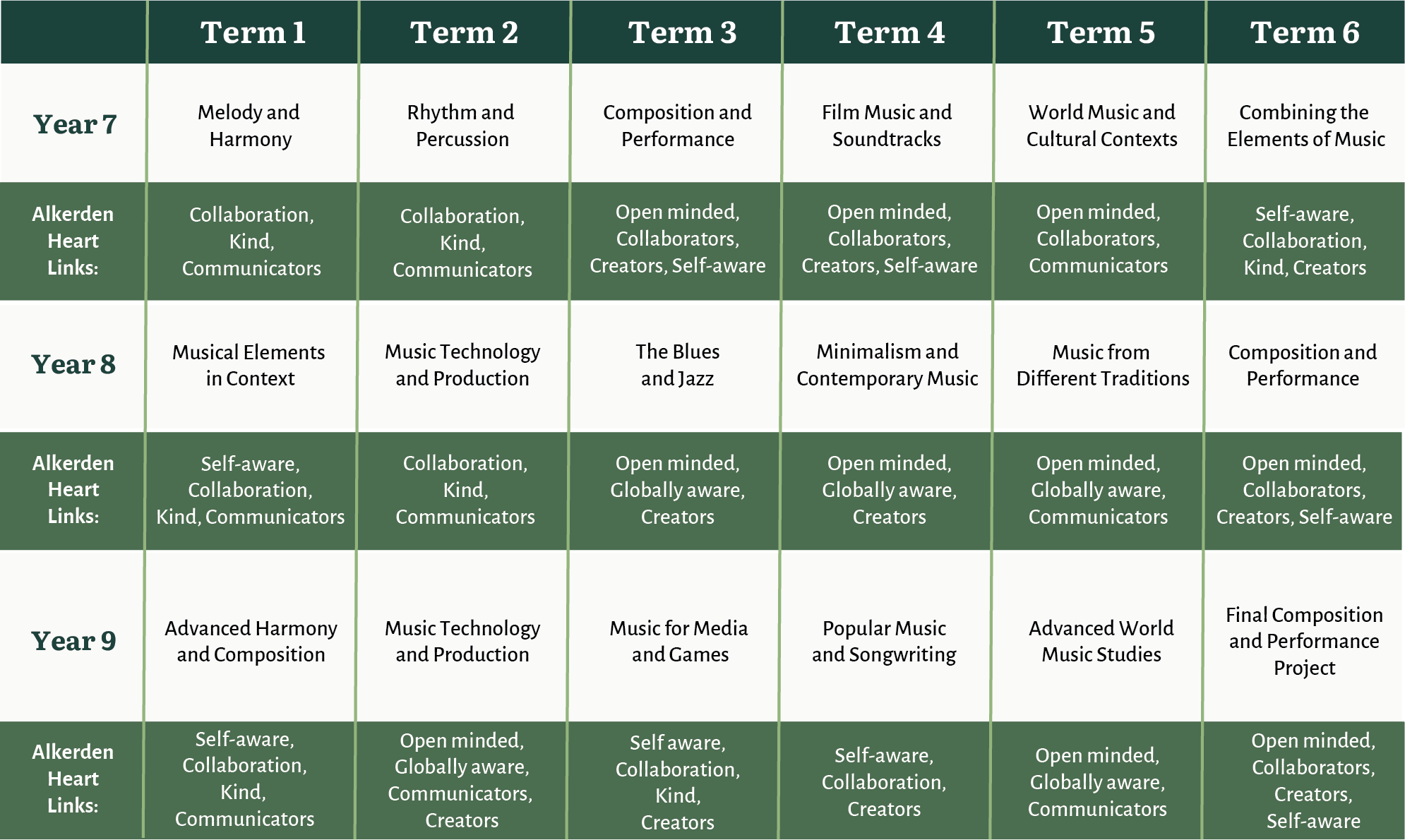 Our KS3 music learning journey is carefully sequenced to ensure progression in knowledge and skills. As with all areas of the curriculum at Alkerden Academy, it remains responsive to the needs of our learners and may be adapted over time to ensure that every learner can thrive.